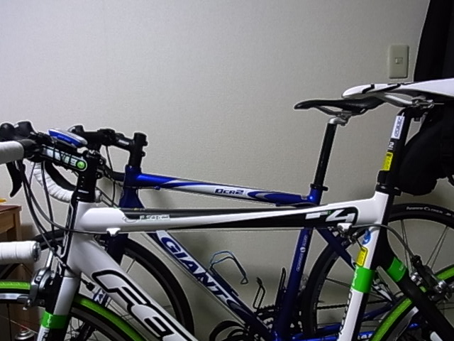 GIANT OCR2(コンフォートタイプ)とFELT F4(レーサタイプ)を横に並べてみたが、いかにF4のポジションがレーシーであることがわかる。ハンドル位置が標準で3cmは低い。