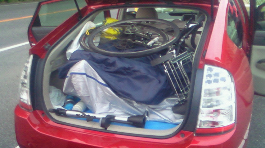 インターネットさんは近所に済んでいるのに輪行で別に帰るのは気分的に嫌だったので、プリウスに全てを詰め込む作戦に(笑)