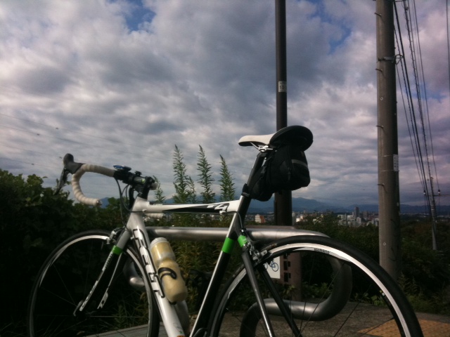 撮影の為、途中でしかたなく自転車を降り、一枚。ここもかなりの斜度があり、体もだいぶ斜めの状態。眼下にはFISCOが見えてサーキットの爆音が響き渡る。正直うるさいw